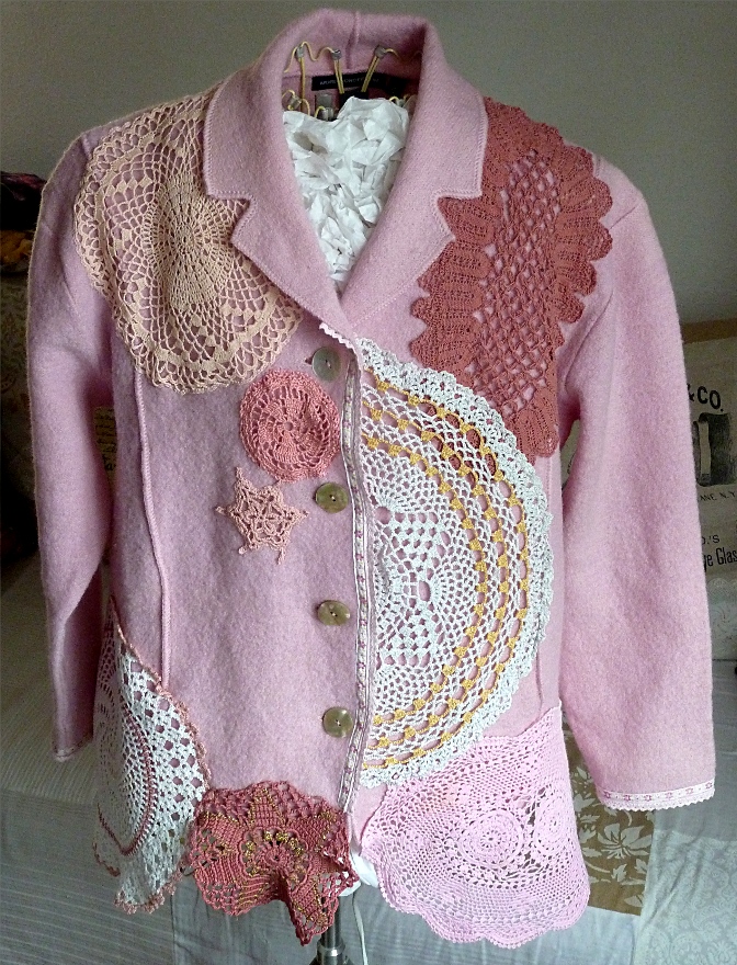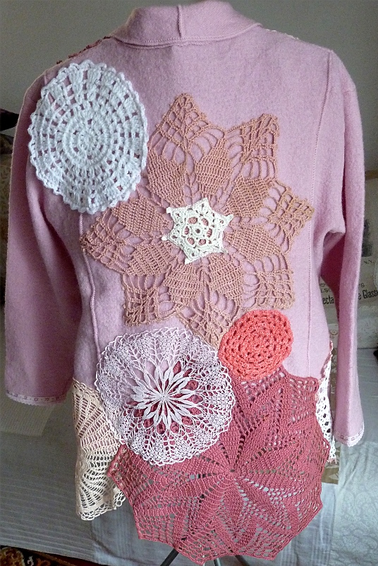 Coming back from a few day’s trip I got a wool jacket on the flea market. It must have been washed too hot, I think, because it had shrunk considerably. In any other way it was okay, and I liked the colour, so I wondered how I could add length to it.. At last I again opted for the „doily solution“!