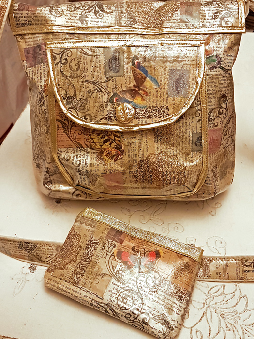 In meinem vorletzten Beitrag (Robuste Taschen aus Papier und Plastik) habe ich die Technik vorgestellt, die ich nun auch hier für ein Set aus Umhängetasche und Kosmetiktäschchen angewendet habe.