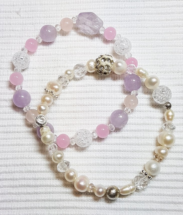 My all-time favourite: a white sinfony. It’s classy but not flamboyant and you can combine it with almost any outfit. Perfect for a bride as well as for everyday. Freshwater pearls in different shapes and sizes, some cracked and some facetted crystal quartz beads and sterling silver beads and charms. A ceramic bead with rhinestones covers the knot.