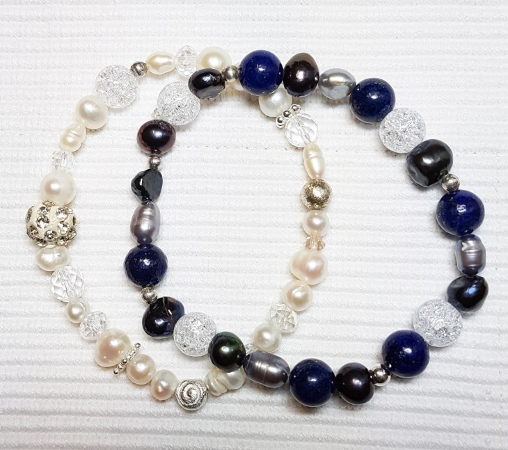 Naja, wenn man oft Schmuck herstellt, sammelt sich einiges an – und in den Armbändern kann man auch „Reste“ verarbeiten. Süsswasserperlenketten gibts oft auf Flohmärkten billig – muss man nicht neu kaufen…