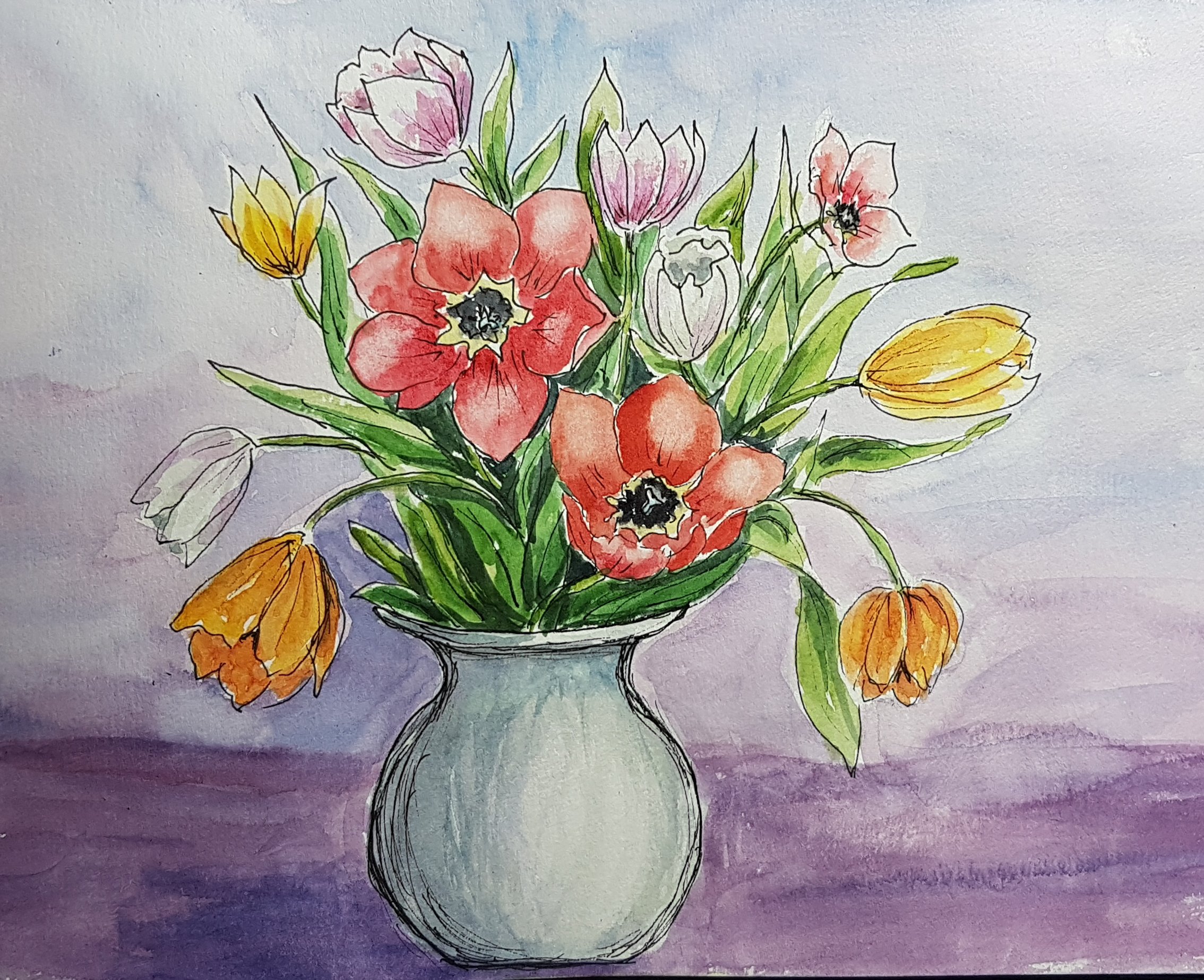 Den Tulpenstrauss habe ich direkt vom Strauss meiner Mutter abgemalt, die anderen beiden aus dem Kopf. Ich schreibe heute nicht viel dazu, weil ich den Beitrag vom Handy sende, das ist zum Tippen etwas mühsam…