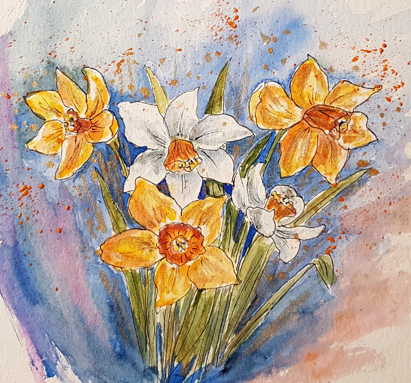 Schneeglöckchen und Krokusse – als Postkarte gemalt.