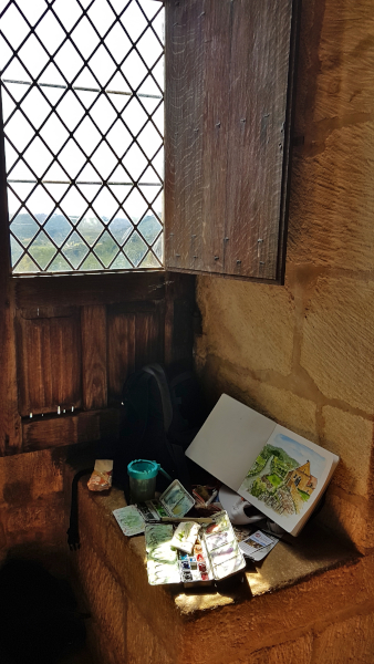 In the castle, I not only found a view, but also a nice place for sketching: the stone window seats where in former days the ladies of the castle had sat with their needle work…