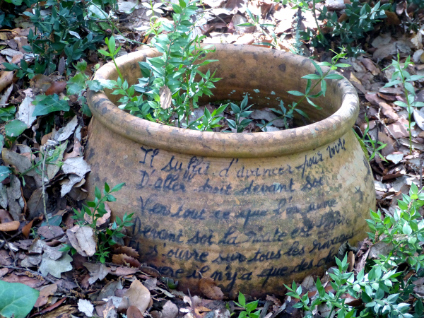 Ich saß am Tisch und blickte in die andere Richtung.- Dann gibt es einen Bereich, den ich mal „Waldgarten“ nenne; hier spielen Bäume, Steine und Moos die größte Rolle, aber es gibt auch Tontöpfe und -scherben, die in der Erde stecken und mit Gedichten beschriftet sind – sehr schöne Idee: