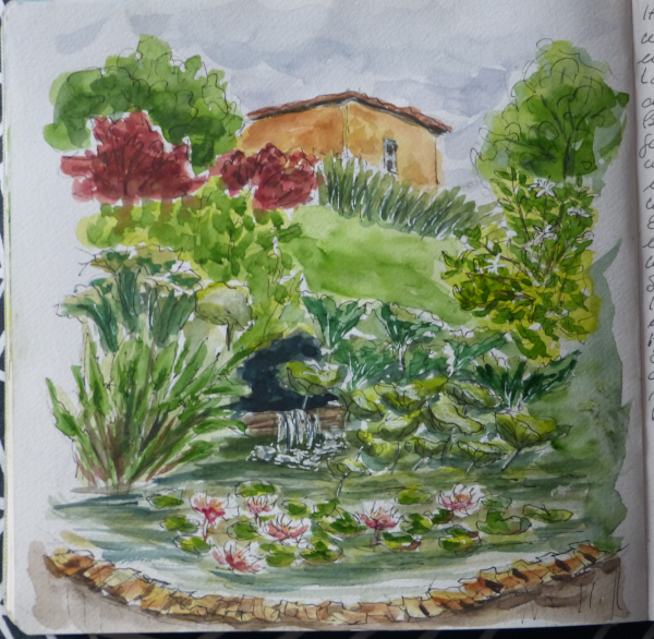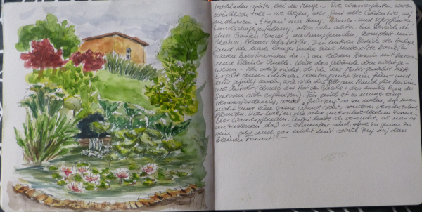 With all the greenery the building on the hill is important for the picture. Also nice: the ocre colour is the same as the stones at the edge of the basin, and the waterlilies „copy“ the red of some of the bushes. A small well adds interest. With so much green it’s always a challenge to interprete the different plants so they don’t merge into a green smudge… But as for the red bushes, I should have left more white spaces… Next time!