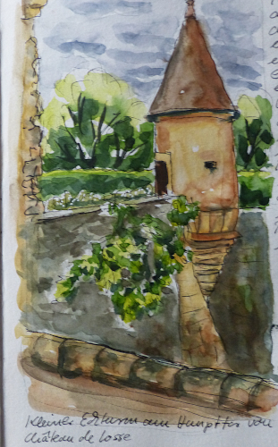 Today, after driving for almost an hour and waiting another half hour at the gates of Château de Losse (should have checked the opening hours in advance…), even having bought a ticket for the visit, I realized that I had forgotten the memory card of my camera (had taken it out the last evening to copy the data onto my laptop). So, only mobile phone pictures possible! Since my phone only has one focal length, that’s not quite satisfying – at least, if you have certain standards for your pictures 🙂 . So, I took more time to sketch!