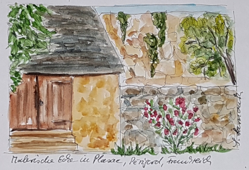 In Saint-Léon-sur-Vézère, einem der schönsten Dörfer Frankreichs, habe ich zwar viele Fotos gemacht, aber nicht so den idealen Platz zum Zeichnen gefunden (mit Sitzplatz). Nur ein kleines Detail habe ich festgehalten, weil es gar so hübsch anzusehen war: