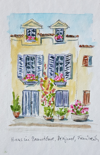 In Saint-Léon-sur-Vézère, one of the most beautiful villages in France, I took a lot of photos today, but I didn’t find the „right“ spot to sketch (with a place to sit). Only one small detail caught my eye because it’s so pretty, and I could do it fast, standing upright: