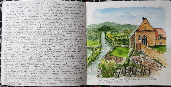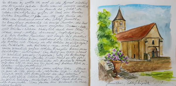 At last, I went to Jumilhac for a guided tour of the castle, which is, from the outside, quite „Harry Potter-esque“. Later, in the gardens, we were allowed to spend some time, so I did this sketch of the chapel in my journal:
