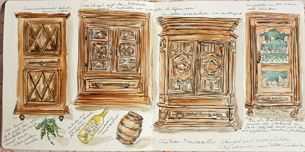 Château Monbazillac is renowned for its wines as well as for its beauty. If you think red wine – no, the soil there is suited for very fine white wine – they get awards on a regular basis. If I’m correct, it’s mostly wines for dessert. You also can visit the castle, or taste the wines. I passed on the latter, the weather being hot, but did the former. Inside the castle the many, heavy wooden wardrobes and cabinets faszinated me, so I sketched some of them – only the lines, because there was nothing to sit on – I did the colouring later.