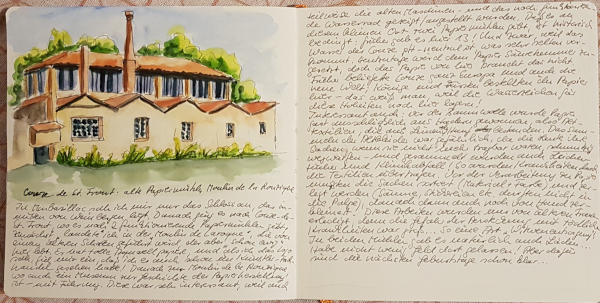 Yes, today I’ve filled two spreads: in Couze-de-St-Front I visited a historical paper mill. There still are two in the village, after 500 years of paper making tradition. At times, there were 13 mills here – why? Because the water of the small river is pH-neutral, which makes the paper last long without adding chemicals. This quality had been very sought-after: Couze supplied the whole of Europe, parts of the new world and many kings and other influential men with paper – the tools for the individual watermarks can still be found here.