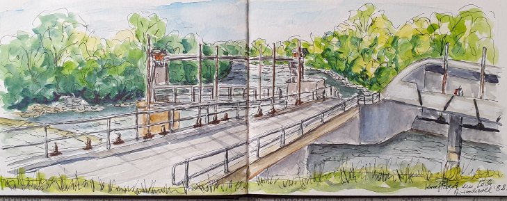 Yesterday in the late afternoon I took a stroll to the river to try and sketch the small water power plant there. That’s adding to the subject „Augsburg’s Water Management“ as well as to my experience sketching a more intricate, hard to understand, structure.