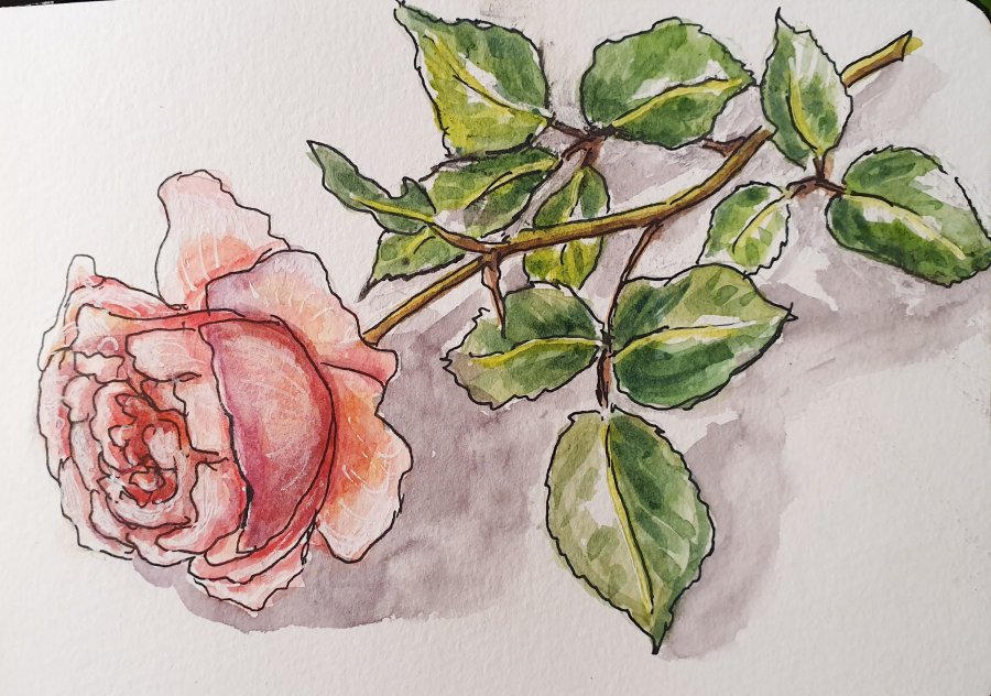 Today, a friend came for coffee and brought me this rose from her garden. Alas, its wonderful perfume can’t be caught in a sketch!