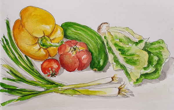 Tomaten und Gemüse habe ich nach der Natur gezeichnet.