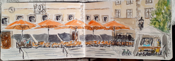 This event took place on the Elias-Holl-Place behind the City Hall; at first there were a lot of people strolling around and I started to sketch… But I’m still so very slow! When I wanted to add the strolling people, none were left. So I just added some very small people on the restaurant terrace and those still in the tent. After finishing, I sat on the steps beneath the umbrella on the right and sketched the houses on the other side of the place: