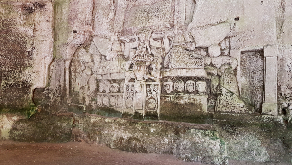 Einst war diese große Höhle ein Ort heidnischer Anbetung, doch mit Ankunft des Christentums – noch lang vor der Gründung der Abtei – in eine christliche umgewandelt. Das untere Bild zeigt das Jüngste Gericht – eine ziemlich gruselige Darstellung..