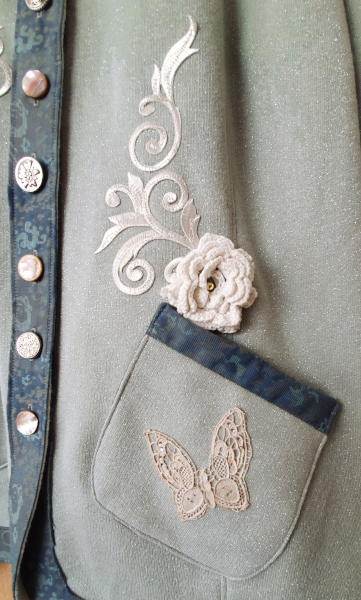 This sweat jacket has been sewn from a light green material with silver tone yarn worked into it. The contrasting fabric is woven cotton. Here I’ve relished adding embellishments: the silver swirls are iron-on appliqués I once had purchased in a sale. After ironing, I decided to also sew them on to be sure they don’t come off in the washing machine. Here I’ve combined them with lace and crochet flowers as well as a small butterfly from antique needle lace. Some flowers show small beads, too, and the buttons are a mix of vintage silver tone and mother-of-pearl buttons.