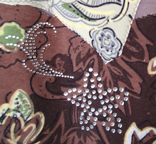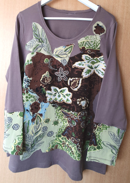 The brown one actually consits of two shirts: in the charity shop I had purchased one which was much too small but showed a nice print, so I cut it up and used it for a large appliqué and the lower parts of the sleeves. Then I added some iron-on rhinestone motives for more interest.