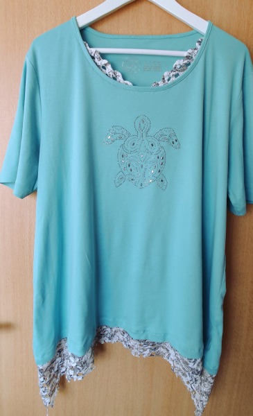 Das türkisfarbene war gebraucht; anscheinend war es mal beim Waschen kurz und weit geworden. Aber es war sauber und mir gefiel die Schildkröten-Applikation. Da ich farblich passende Spitze hatte, habe ich das Shirt zunächst etwas enger genäht und dann am unteren Rand sowie am Halsausschnitt Spitze angenäht. Das „natürliche“ Zipfeln des Shirts habe ich betont, indem ich die Spitze unten seitlich breiter geschnitten habe, das gibt den modernen Zipfel-Look.