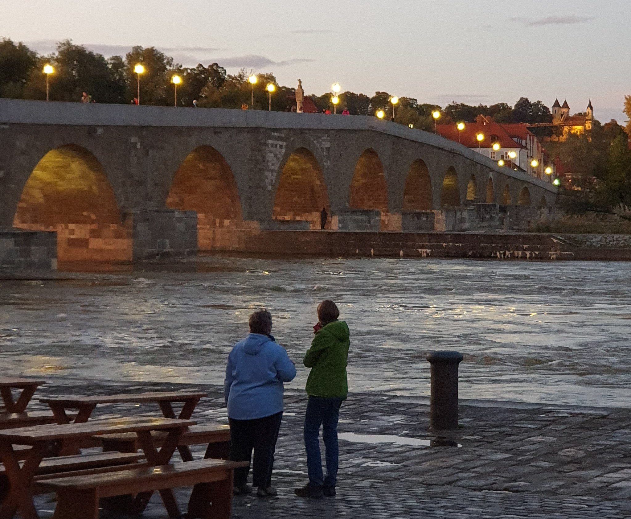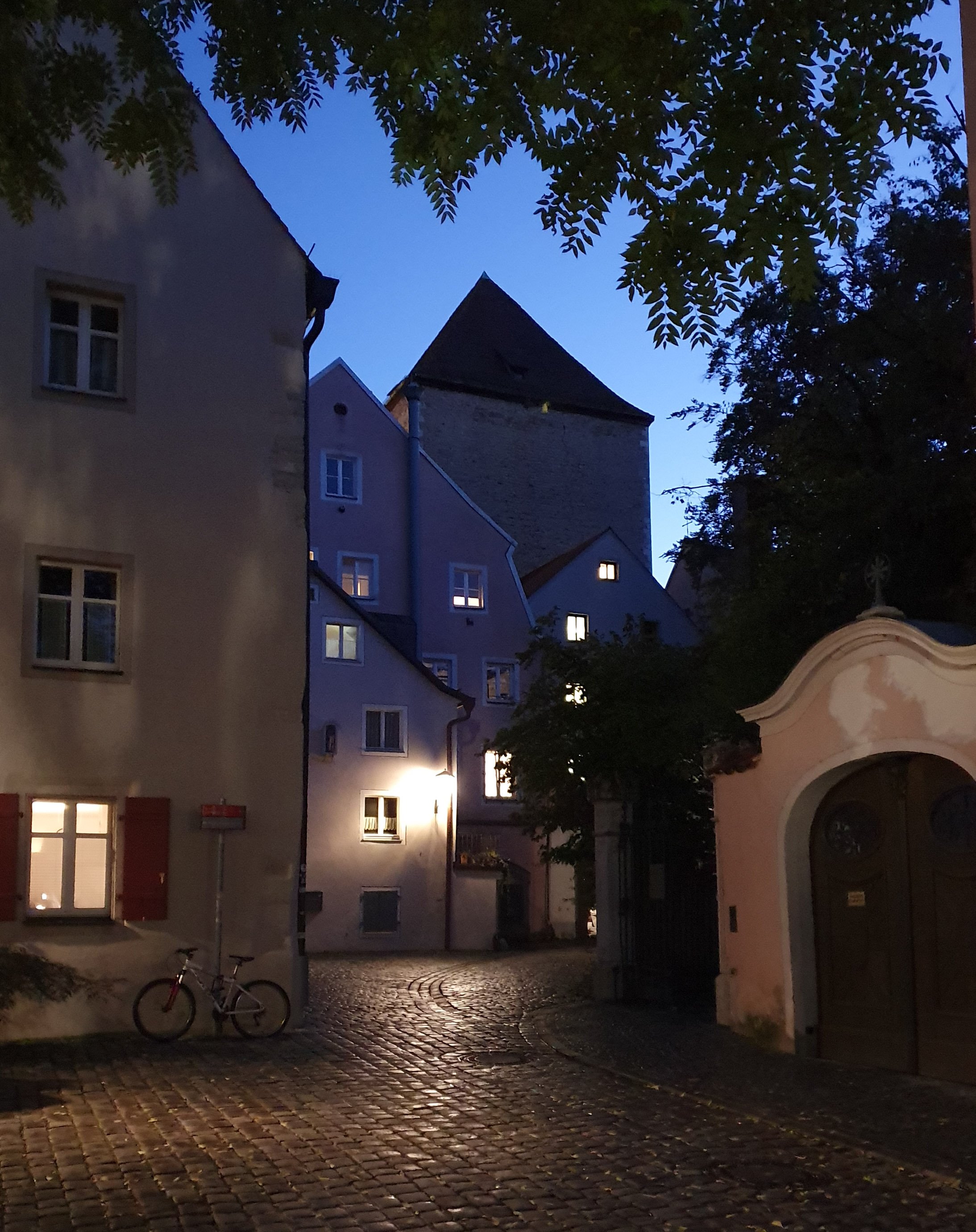 Momentan bin ich mal wieder auf Fortbildung in Regensburg. Im Juli war ich ja schon mal hier, da war es abends lang hell und warm. Diesmal war es nach dem Unterricht zunächst zu nass, dann nach dem Abendessen zu dunkel zum Zeichnen. Doch die (Licht-) Stimmung war so schön, dass ich sie mit ein paar Handyfotos eingefangen habe.