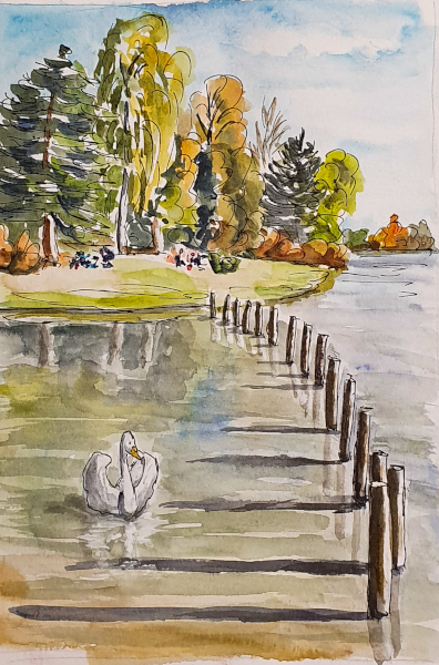 In my part of town there’s a recreational area with a small lake – this weekend it was almost crowded! The balmy weather with up to 25°C only left some coloured trees to point at the season. I did several sketches there but like to show them in different posts. This one has been done in the late afternoon; first, I did the swan, wanting to catch him before he took off… People on the shore from this perspective – and on the small format of the sketchbook – only were like ants…