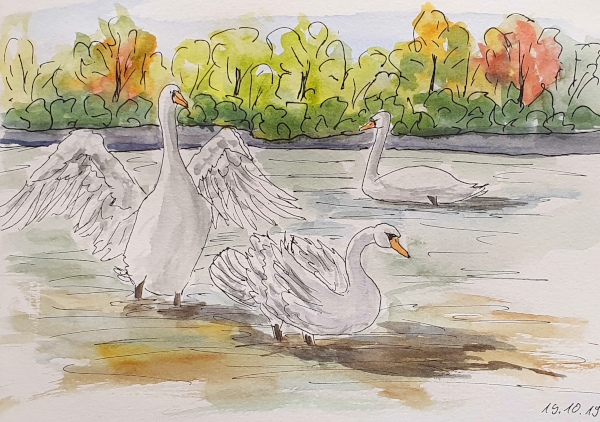 Wanting to enjoy the last warm and sunny day, I again went to the lake in my part of town where I already had done sketches the weekend before. First, I did a study of swans, just pencil strokes, only later at home opting for a colour wash and a complete scene.
