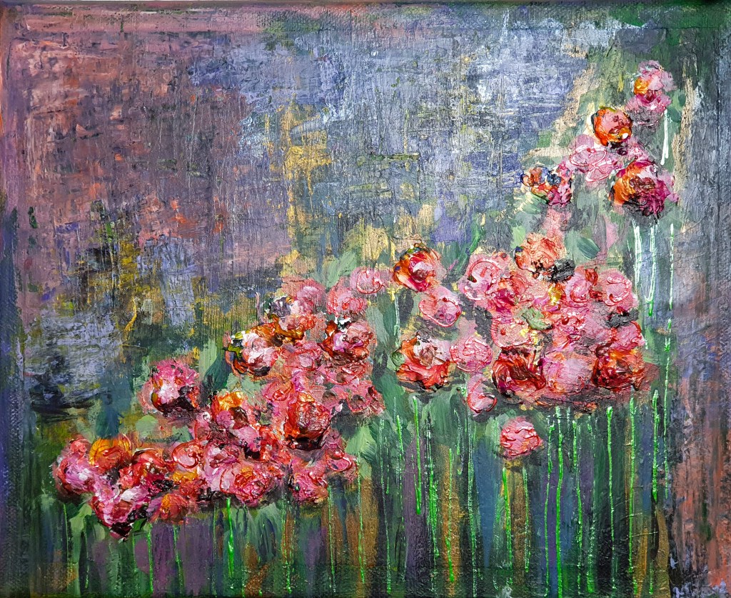 Since the acrylics still ly on my table I intend to do some more pictures before again putting them back into the cabinet. Today this half-abstract „Rose Garden“ using structural paste has kept me busy. The paste was almost dried out (had bought it once for a small project and afterwards never used it), but just still usable… With acrylics I always try to create layers and depth.