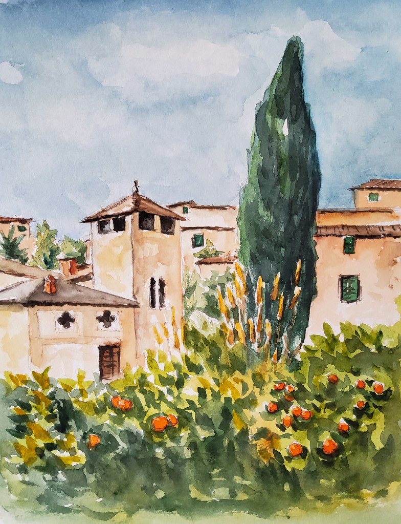 Another picture from my Périgord series. At the time I had already used this motive for a sketched postcard, now I’ve done it as a larger watercolour. A friend just asked me to also post the sizes of my works because they’re hard to know from the screen: well, I’ll try to remember that! This one is 30x24cm (11,8×9,4inches).