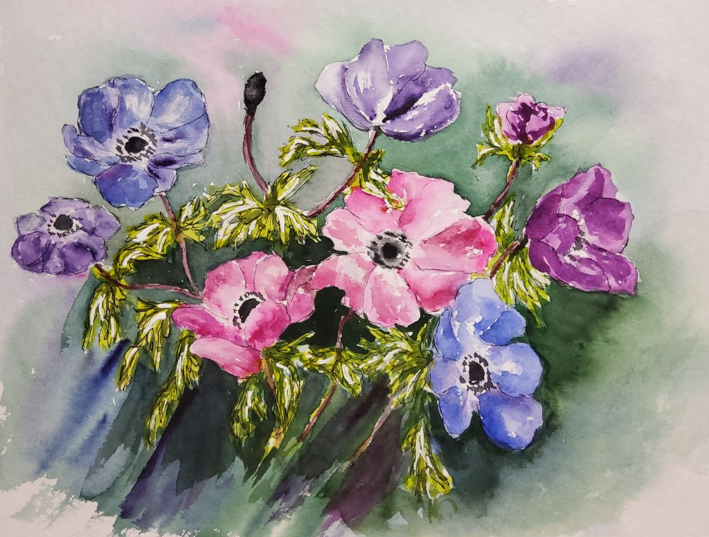 Wie angekündigt, habe ich jetzt ein Aquarell nur mit den großen Anemonen gemalt. Größe: 30x23cm.