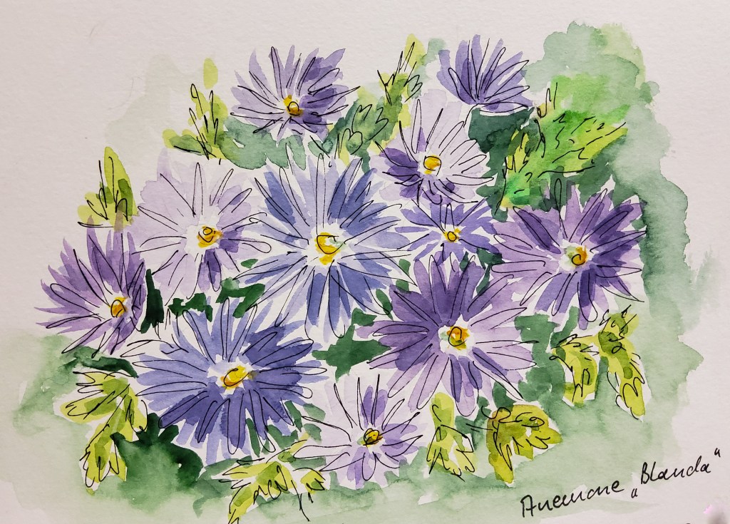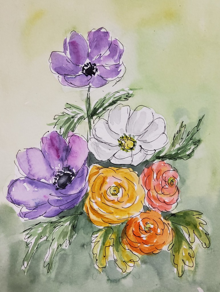 All three sketches are 20x15cm (7,8×5,9inches) The last picture shows a smaller kind of anemones, which grows in flowerbeds and shows colours from white, light blue, blue, purple and violet. The large anemones in vivid colours are „lively“ flowers which make me want to do a larger watercolour…