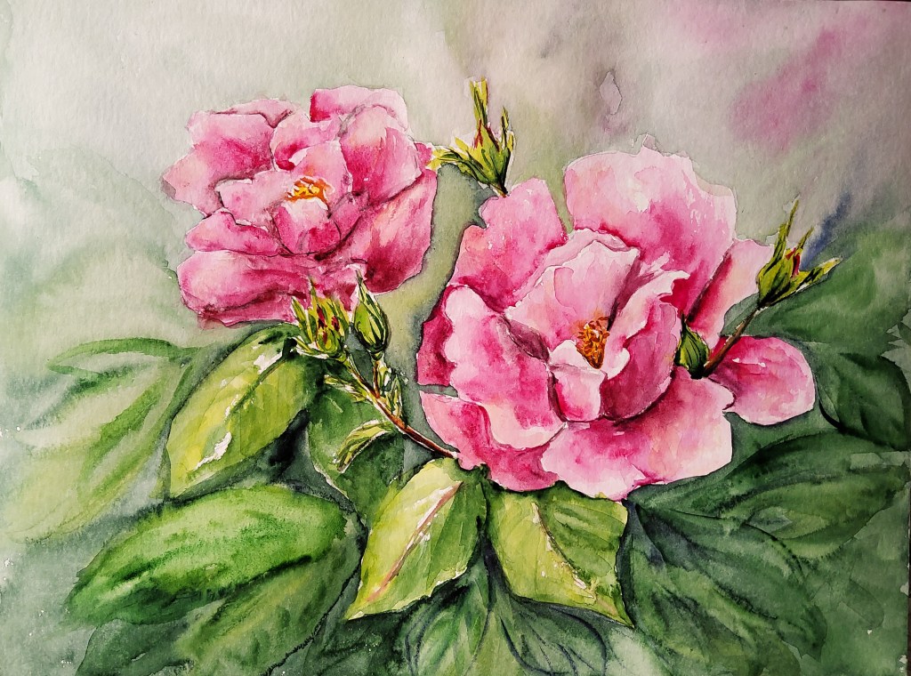 Nun habe ich den „weiten Weg“ von der Nähmaschine an den Küchentisch gemacht, wo ich mal wieder den Pinsel schwingen wollte. Eines meiner Rosenfotos war Inspiration für dieses 40x30cm große Aquarell.