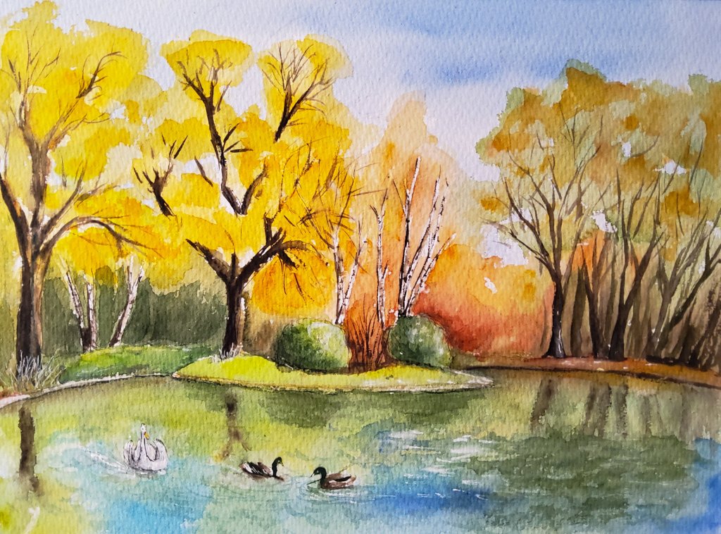 Years ago I had spent an Easter Sunday in the English garden in Munich. Browsing through my photo albums (analog ones), I came upon them now and have turned one into a watercolour. At the time the park was quite crowded, only at this pond I had found a bit of quiet. The blooming willows sported a bright yellow, while most other trees and brush still showed winterly brownish hues.