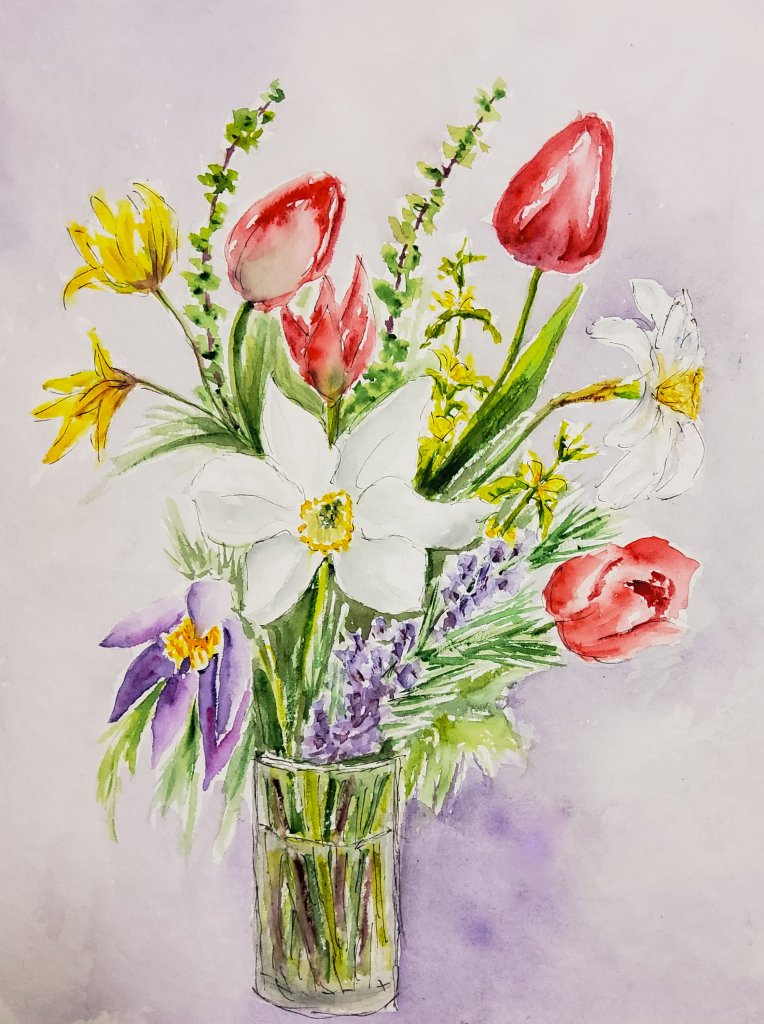 Gestern brachte mir eine Freundin diesen wunderschönen Strauß aus ihrem Garten, den ich nun als Ostergruß für Euch alle gemalt habe. Trotz der ganzen Einschränkungen und Probleme, unter denen wir alle in dieser Krise zu leiden haben, wünsche ich, dass Ihr an den Feiertagen auch Freude und Hoffnung erleben erleben dürft!