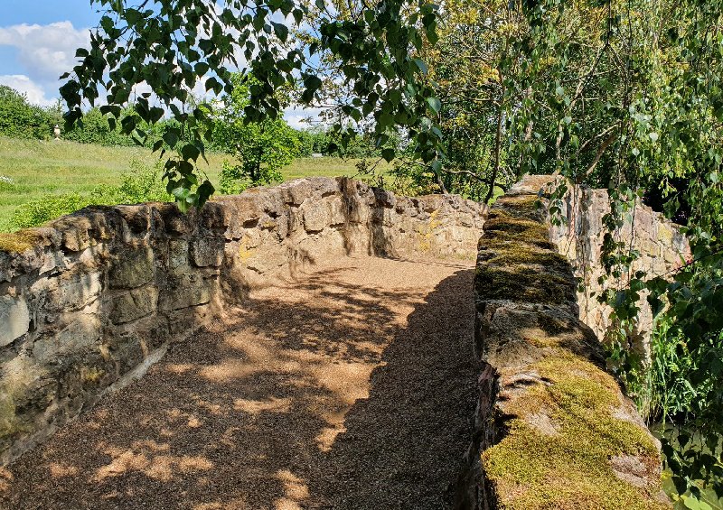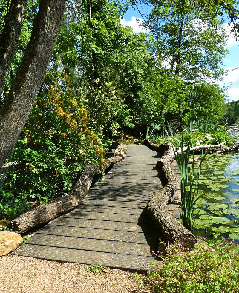 Ganz allgemein: man sollte gutes, festes Schuhwerk tragen, denn die Wege sind teils schmale Pfade, nach dem Regen auch mal matschig, und es geht auf und ab. Naturbelassen eben! Ganz faszinierend auch die vielen unterschiedlichen Brücken, teils etwas abenteuerlich, da wackelig (Hängebrücke, Pontonbrücke…), die u.a. 11 kleine Inseln im Schlossteich verbinden.