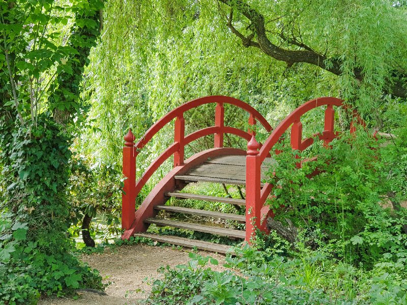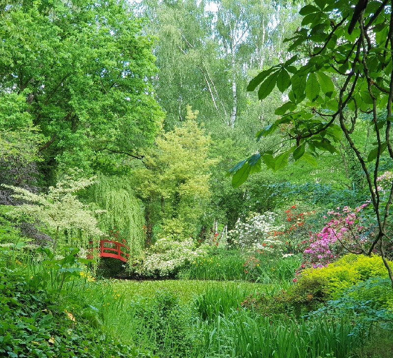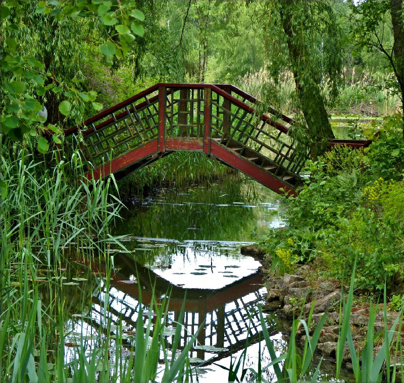 Im ganzen Garten und Landschaftspark gibt es nicht nur Brücken, sondern auch Skulpturen (viele asiatisch), sowie Bauwerke, die die Landschaft nicht stören, sondern erhöhen. Sogar einen aus Bhutan importierten Tempel!