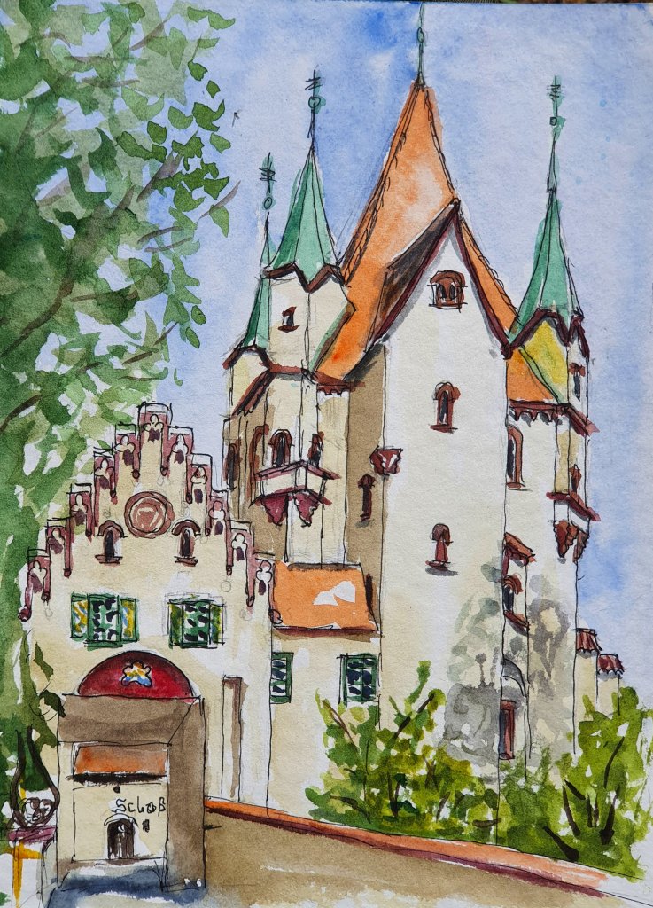 Bei dem schönen Wetter heute wäre ich so gern gewandert oder geradelt, doch da ich ja immer noch mit Krücken unterwegs bin, musste ich mir etwas anderes einfallen lassen zum Sonne Tanken. Ich fuhr ein Stück Richtung Süden, um bei Schloss Kaltenberg ein bisschen zu spazieren und zu zeichnen. Der verwinkelte Turm war nicht einfach, aber dafür umso interessanter!