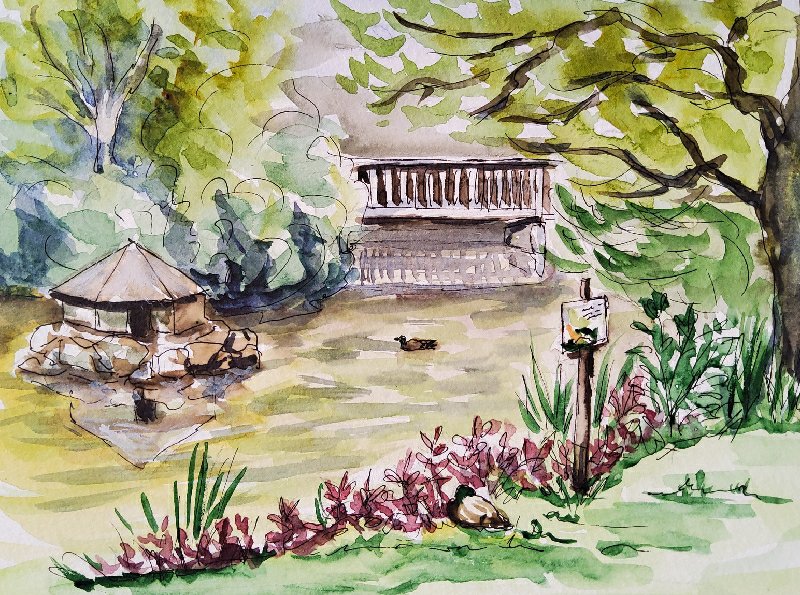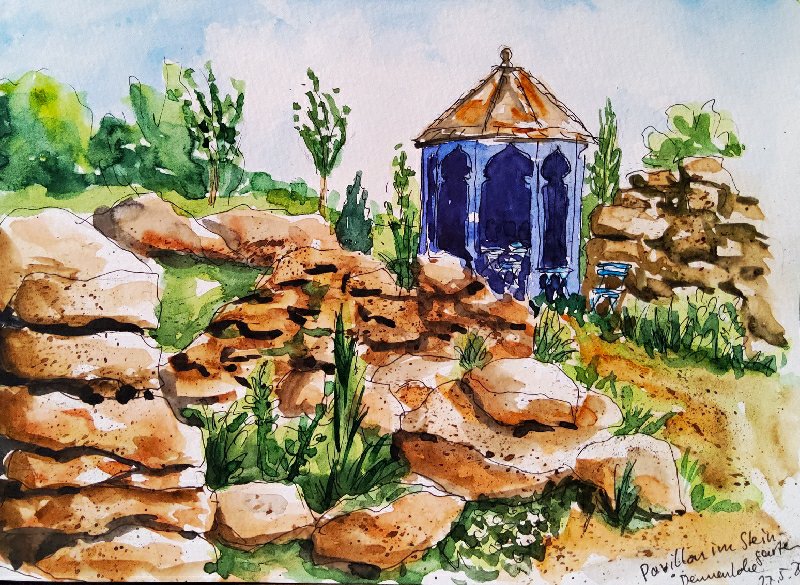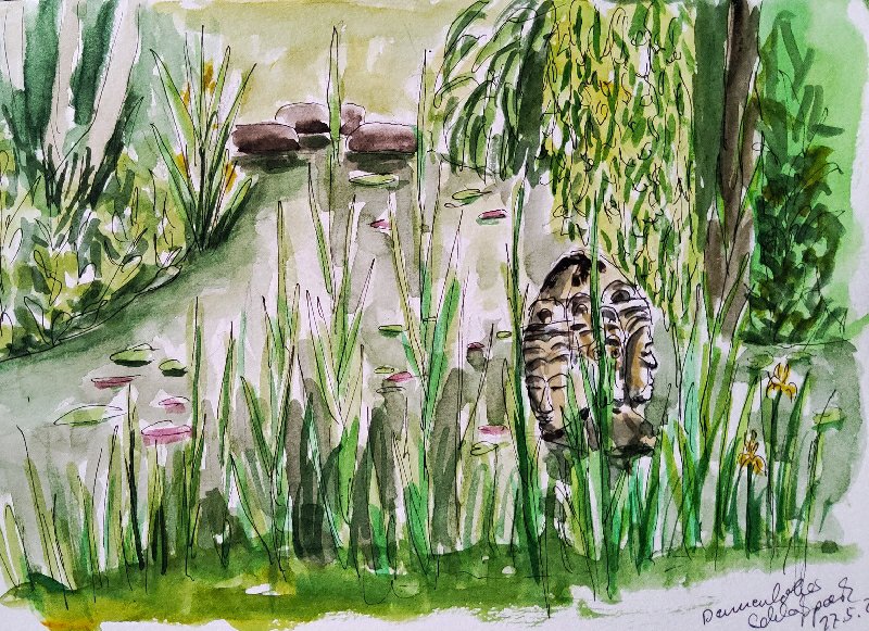 Gestern habe ich den ganzen Tag im Schlossgarten von Dennenlohe verbracht, insgesamt 7 Stunden! Der Ort liegt in der Nähe von Ansbach, in Franken. Aber die Fahrt (1,5 Std.) hat sich gelohnt. Der Park ist riesig, es gibt so viel zu sehen (und zu fotografieren und zu malen), dass ich bei diesem Besuch noch gar nicht alles gesehen habe. Eine genauere Beschreibung mit vielen Fotos poste ich im nächsten Beitrag. Heute zeige ich vorerst nur die dort entstandenen Zeichnungen. Oben: Pavillion im Steingarten. Unten: die asiatische Skulptur steht im Wasser.
