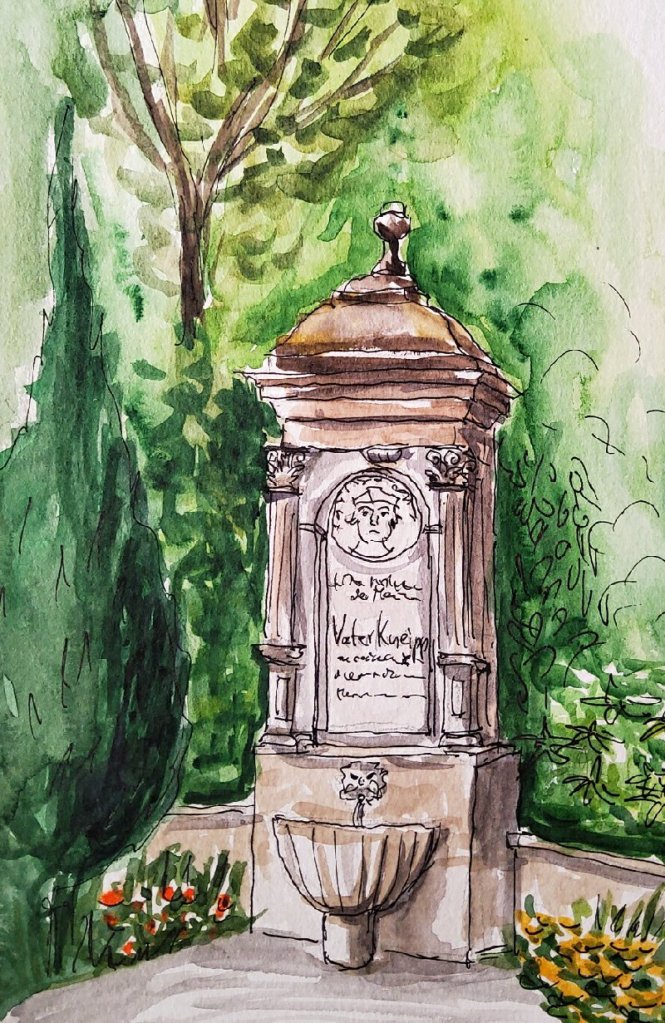 Today I made a little trip to the town of Bad Wörishofen, a health resort in the Allgäu region, about a 30-minute drive from Augsburg. Since there still aren’t any spa guests because of the corona crisis, I spent three very quiet and relaxing hours in the beautiful spa gardens, walking and sketching. At the entrance to the gardens this fountain is dedicated to the priest Sebastian Kneipp, who, in the 19th century, treated patients here with his water cure.