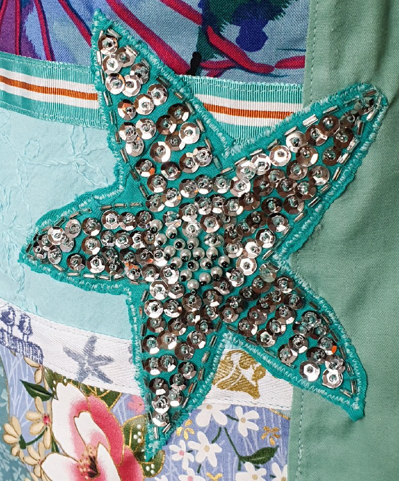 On the front, I’ve added two flowers?stars?starfishes? of beads and sequins, cut from an old shirt years ago.- Next time I’ll again show some small sketches, done with little time on my hands…