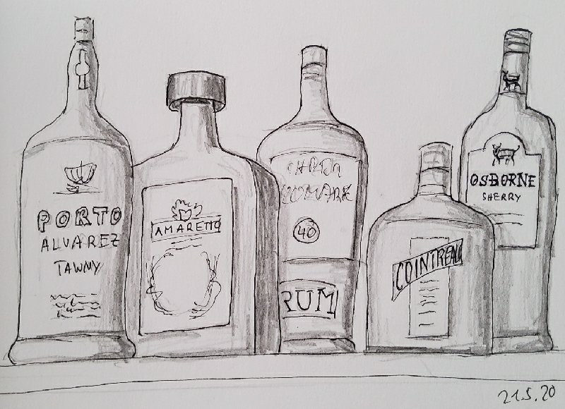 Meine „Bar“ steht in der Küche, denn ich verwende Alkohol fast nie zum Trinken (mal ein Glas Sekt zum Anstossen oder ein Radler im Sommer sind so ziemlich alles), aber ich liebe ihn zum Würzen! Ein Schuss Wein oder Sherry in die Soße, Portwein zur fruchtigen Nachspeise, Rum ins Gebäck oder Amaretto in die Marmelade, das ist fein! Natürlich nur, solang keine Kinder mitessen…