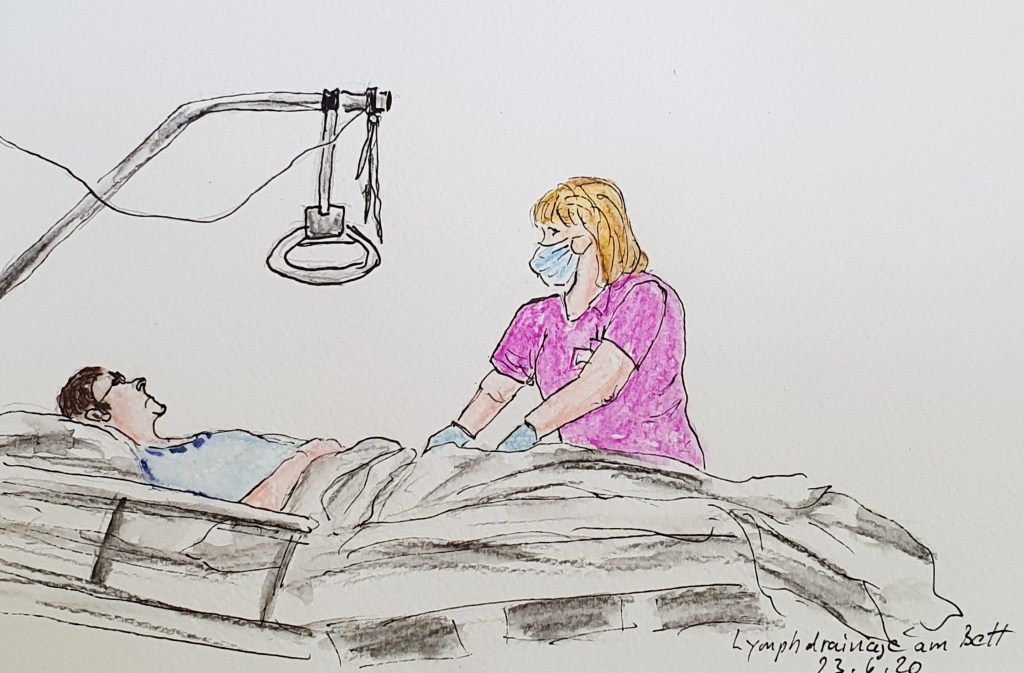 The view of my leg after surgery – still with cool pack, bandaged and with the odd knee-tights. Not wanting to make a mess with watercolours in bed, I’ve brought watercolour pencils and a waterbrush.
