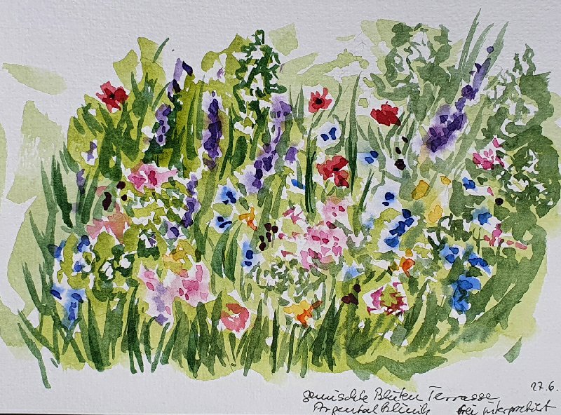 Jetzt, am Wochenende, gibt es keine Therapiestunden, und wegen Corona auch kein Unterhaltungsprogramm. Wer mobil ist, macht Ausflüge in die Stadt oder Umgebung, doch mein Bein lässt das noch nicht zu. Dafür habe ich umso mehr Zeit zum Zeichnen! Heute habe ich mir zunächst das wunderschöne, bunt gemischte Blumenbeet auf der Terrasse vorgenommen. Oben: eine Studie der einzelnen Blumen, unten: frei interpretierte Gesamtansicht. Beide Bilder entstanden im Büchlein A5.