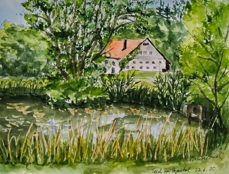 Today, the morning was filled with treatments and gymnastics, but in the afternoon I was free. The weather still looking rainy, I took my raincoat and went for a walk without my art supplies. I was wrong: it got more sunny every minute! Thus I went much farther than I had expected, proud to say that – still with crutches for safety – the walk took more than an hour. Some short pauses on benches included… So I got a nice impression of the surroundings, the lower Argen valley. The Argen being a small river flowing from the foothills of the Alps into Lake Constance, it’s been left to its natural meandering state. The landscape is dominated by willows, reed and tall weeds, with hills in the background. Meadows and acres show old little barns and there are a lot of buzzards and other birds of prey flying high and low. Not having brought my camera/phone, I’ve done this landscape watercolour from memory back in my room.