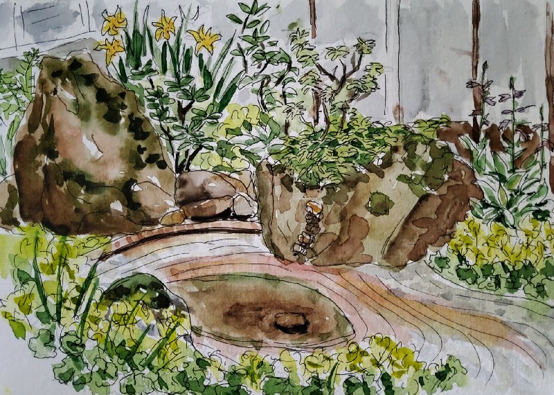 Im Zentrum des Klinikgebäudes gibt es einen Lichthof, in dem auf schätzungsweise 30-40qm ein kleiner Japangarten angelegt ist. Er kann betreten werden und bietet sogar drei Bänke zum Sitzen – perfekt zum Zeichnen! Typisch für den japanischen Stil ist die Verwendung von Steinen, Moos und Wasser, letzteres hier als gemauertes Bassin, nur wenig größer als eine Vogeltränke. Die Vielfalt der Pflanzenformen ist auch Gestaltungsmittel, daher habe ich mich hier für die „Line and Wash“ – Technik entschieden, die das beim kleinen Format (A5) am besten wiedergeben kann.