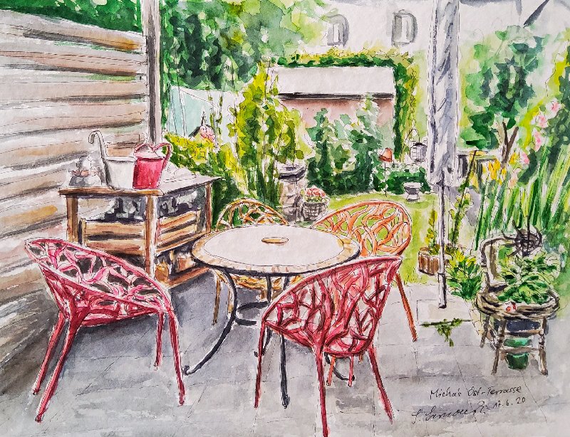 Gestern war ich bei einer Freundin, die sowohl vor dem Haus als auch dahinter jeweils etwas Garten und eine kleine Terrasse hat. Ich bin immer wieder erstaunt, wieviel man mit Kreativität aus einem kleinen Reihenhausgarten machen kann! – Und nun wird es Ernst für mich: morgen bekomme ich ein neues Kniegelenk! Bin schon ein bißchen aufgeregt, denn das ist keine kleine Operation. Nach dem Krankenhaus komme ich noch für 3 Wochen auf Reha und hoffe doch sehr, dass ich dann die Krücken endlich in die Ecke stellen kann! Mein Malzeug nehme ich aber mit und werde dann von dort aus posten!