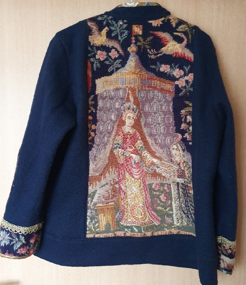 Neben dem ständigen Ändern meiner vorhandenen Kleidung hatte ich mal Lust auf ein neues, kreatives Stück. Ein grosser, alter, handgestickter Gobelin vom Flohmarkt wurde zusammen mit farblich passendem Walkstoff zu dieser außergewöhnlichen Jacke verarbeitet.
