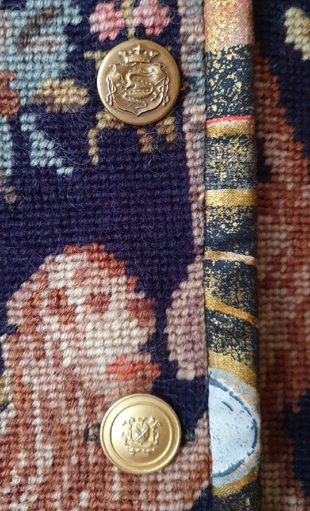 The centre of the scene also is the centre of the back, the sides are now the front centre and what was left I used for the sleeves. The gold tone border on the sleeves also is a vintage piece. A small needlepoint with flowers now features on one of the pockets, as appliqué.