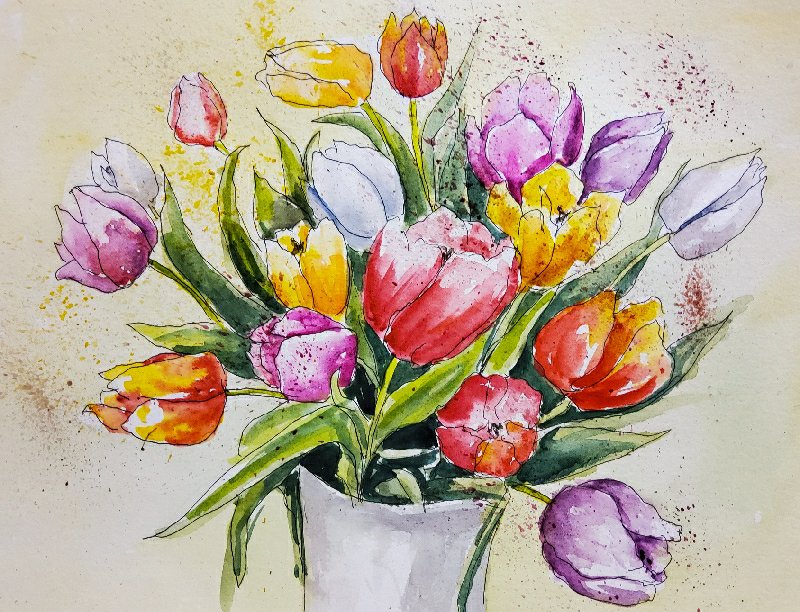 Da ich in letzter Zeit häufig für Kollegen auf dienstlichen Touren in Friedberg (östliche Nachbarstadt von Augsburg) und Umgebung eingesprungen bin, habe ich dort einige Wege entdeckt, die zum Spazieren und Wandern einladen. Diese Woche habe ich frei und das Wetter macht auch mit, drum war ich heute für 2 Stunden dort unterwegs. Die Natur ist ja größtenteils noch grau-braun, doch ein wenig Grün gibt es. Auf der Strecke hatte ich nur das Handy dabei und habe damit einige Bilder als Malvorlage gemacht. Das erste wurde gleich heute umgesetzt! Leider wirkt der Himmel auf dem Foto viel heller und fader als auf dem Original-Aquarell…