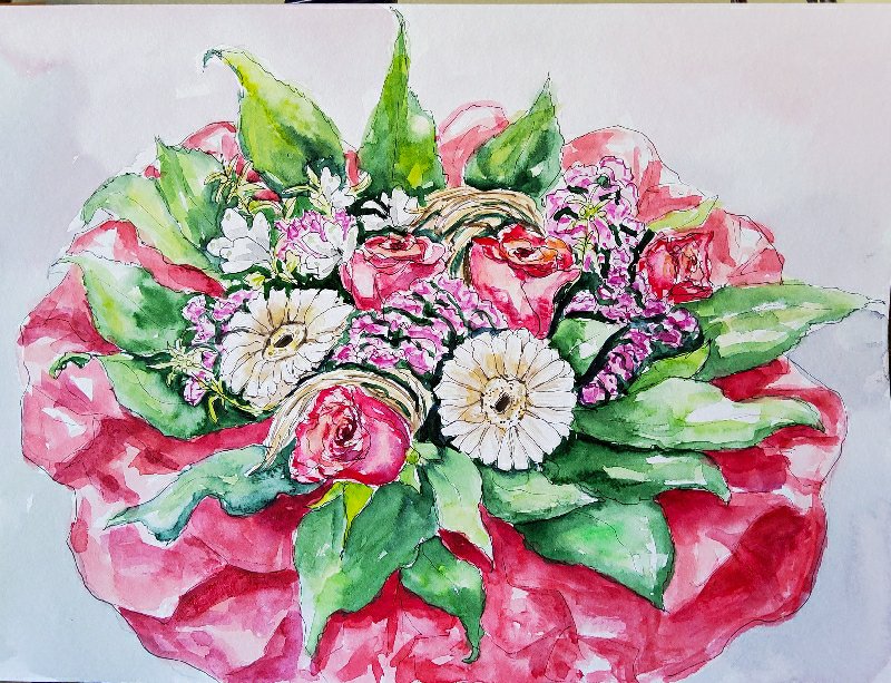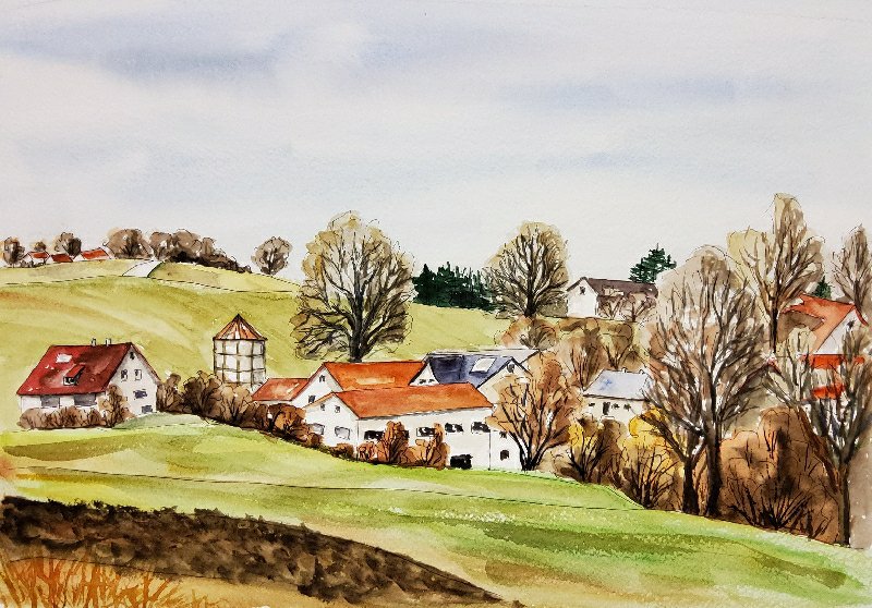 Lately, I had to work a lot in the nearby town of Friedberg and the surrounding villages, thus discovering several nice places and paths, inviting me for a walk. This week, the weather is fine and I’m free, so today I took a walk in the area. The nature still doesn’t show much colour except a bit of green here and there. I took some pictures with my smartphone as reference for future watercolours, finishing the first one this evening. Alas, the sky on the photo looks much lighter and less interesting than in the original painting…