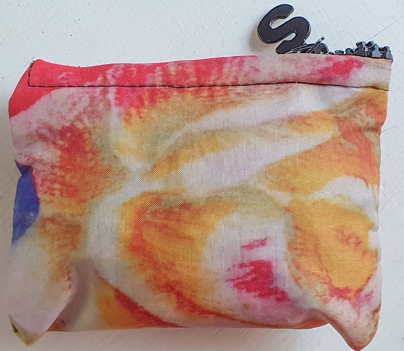 Best of all: the umbrella pouch with its zipper only needed two short stitched seams to reduce it to this small pouch to store the folded tote! And the pendant of the zipper (the umbrella having been by Desigual) shows the first letter of my first name … 😊
